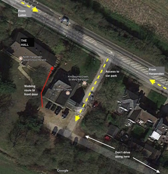 The ONLY vehicular access is along the driveway beside St Mary’s Church, as shown by the yellow arrow. The red arrow shows the path to the main entrance. Our hall should not be confused with the church hall (which is part of the church).