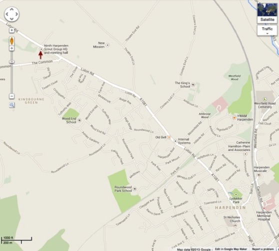 This map shows the location of the hall on the outskirts of Harpenden, 5 minutes drive from, say, Sainsburys on the High Street.